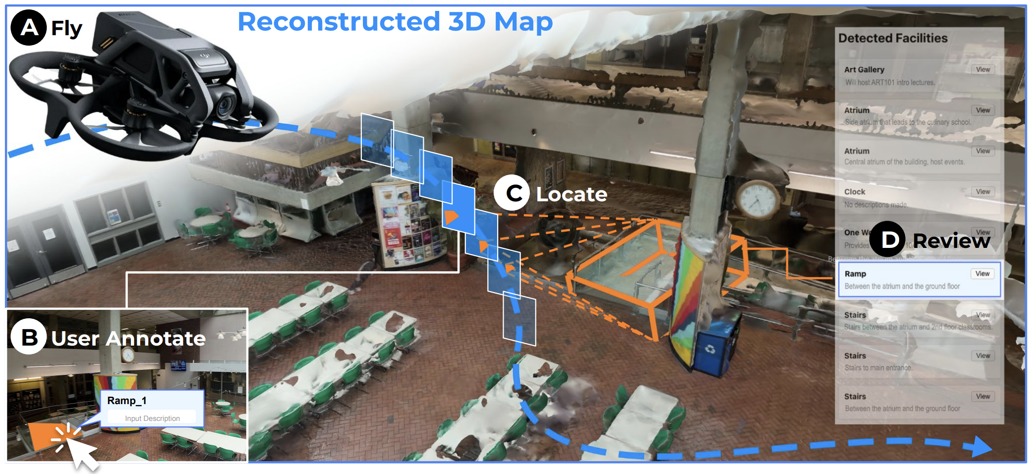 Spatial reasoning and world understanding — building indoor mapping, navigation, and assessment tools using drones, computer vision, 3D graphics, and MLLMs. I aim to advance how AI perceives and reasons about spatial environments for navigation, accessibility, and safety.